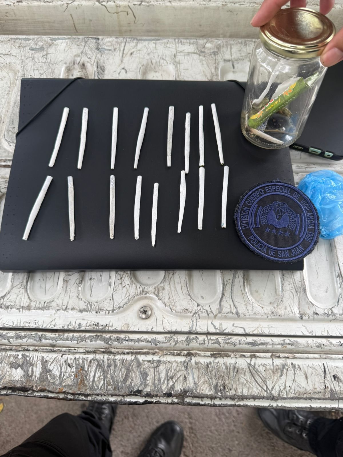 Al entrevistarlo, el sujeto adoptó una actitud nerviosa y hostil al solicitarle que exhibiera el contenido de su mochila. Ante la negativa, se realizó un palpado de urgencia y se constató que llevaba un frasco de vidrio con tapa metálica dorada con sustancia vegetal verde, un papel de liar marca Guaraní, dos cigarrillos armados por la mitad de la misma sustancia y un envoltorio de plástico azul con 16 cigarrillos más, aparentemente de marihuana.