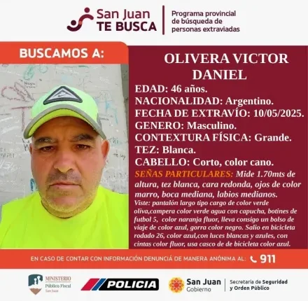 Diferentes comisiones y secciones de la Policía de San Juan, inclusive el personal del programa «San Juan te Busca» trabajan para dar con el paradero de Daniel Víctor Olivera, quien salió de su casa y hasta el momento, no hay señales de su paradero, ni tampoco se puso en contacto con sus familiares.