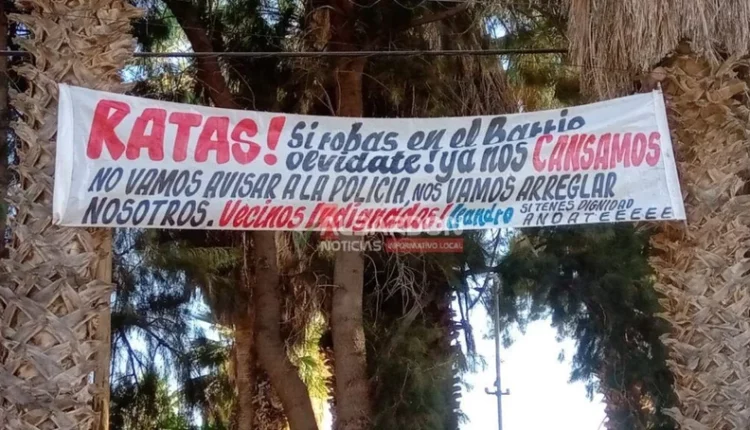 “Si robas en el barrio, no vamos a avisar a la policía, nos vamos a arreglar nosotros”. Este fue el pasacalle que apareció este miércoles en Albardón, precisamente en la Villa San miguel, un lugar donde los vecinos están hartos de vivir en un contexto de inseguridad. El antecedente más reciente fue el violento robo a un anciano que terminó con múltiples golpes en su rostro, producto de los malvivientes.