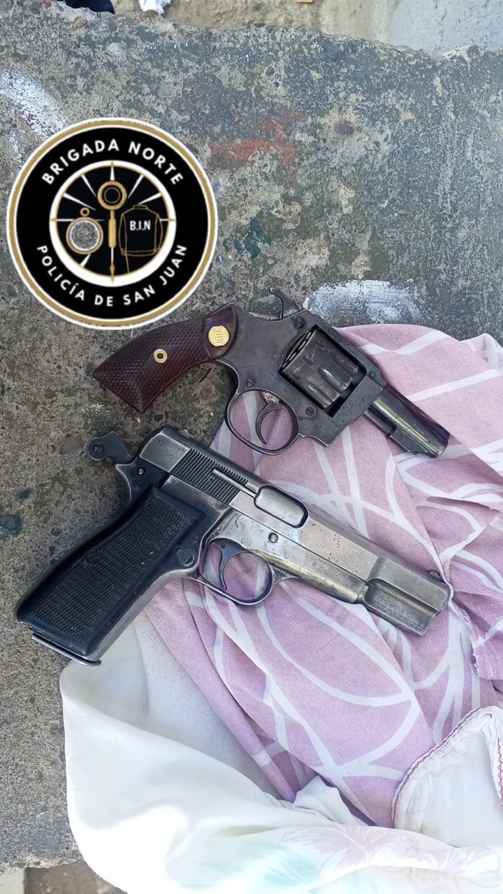 Durante el palpado de urgencia, hallaron entre sus ropas la pistola Browning 9mm con cargador y municiones, y el revólver calibre 22 largo con municiones.