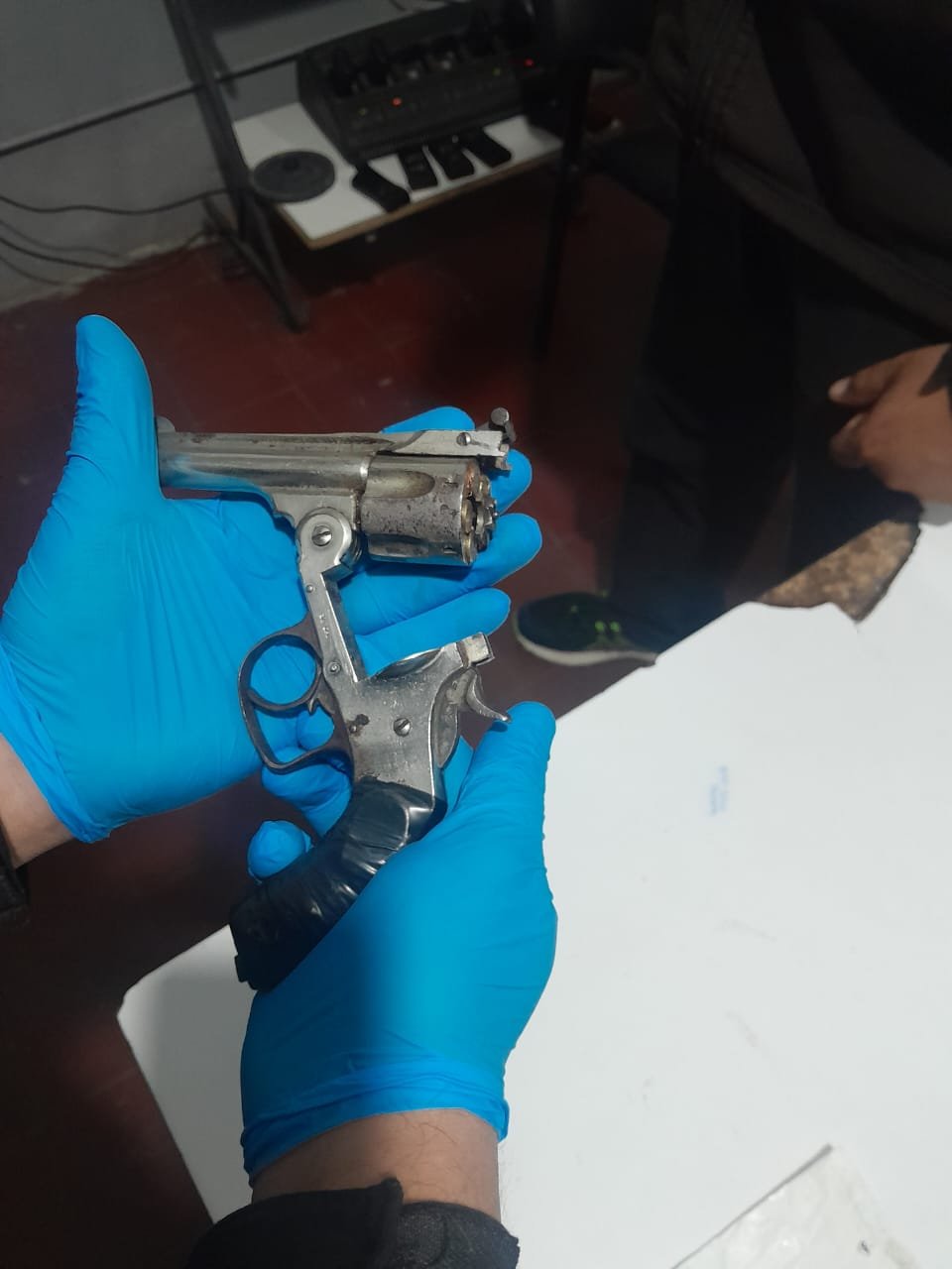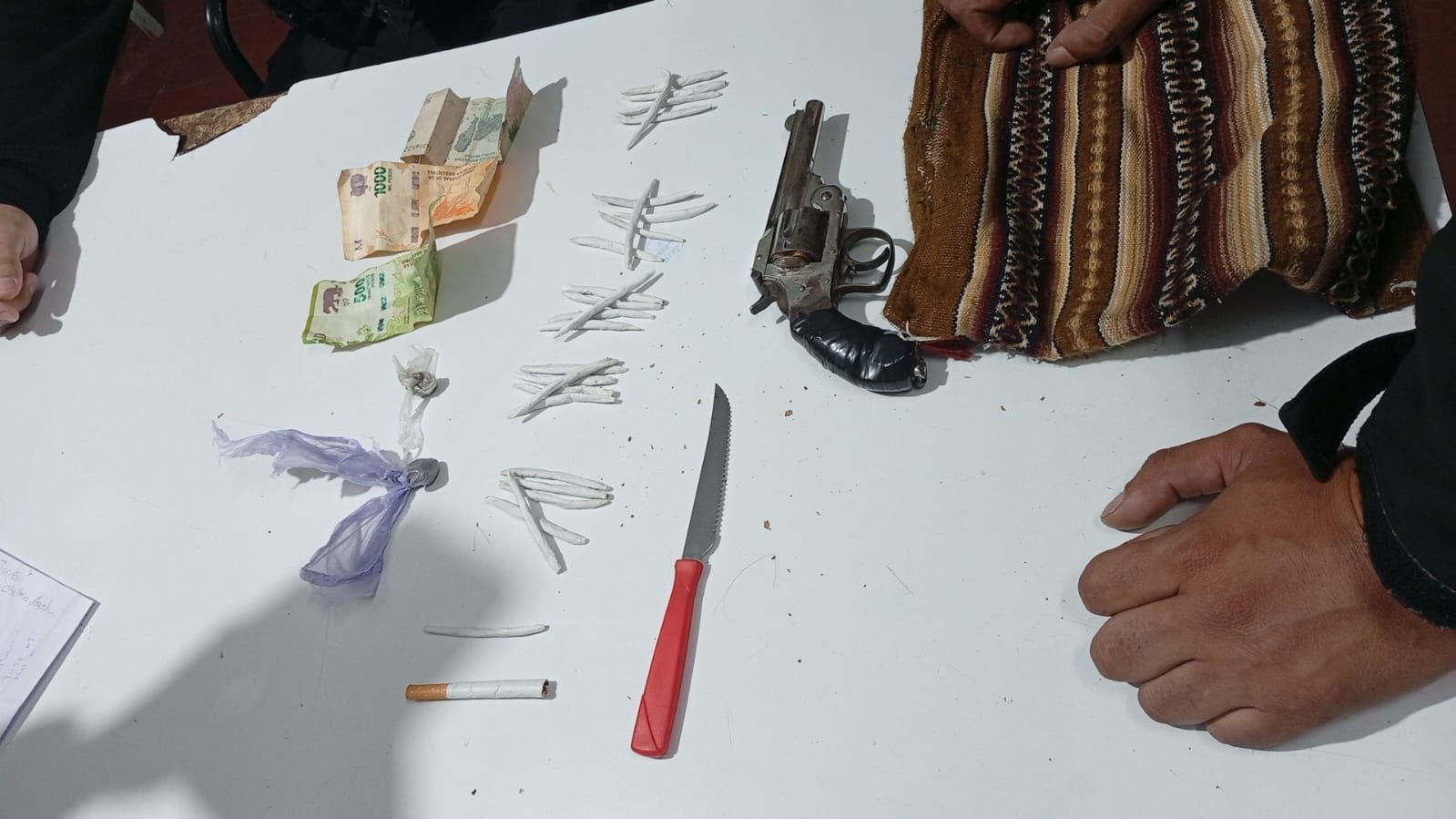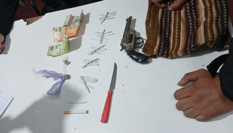 En su poder se encontró un revolver calibre 38 largo con munición, 26 cigarrillos armados caseros de marihuana, 2 envoltorios de marihuana y un cuchillo tipo Tramontina.