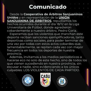 La violencia volvió a manchar el fútbol universitario en la Universidad Nacional de San Juan. El árbitro Pedro Coria sufrió una agresión física luego del encuentro decisivo entre Antorcha y El Almendro en la Liga Universitaria, disputado en el Complejo Deportivo El Palomar.