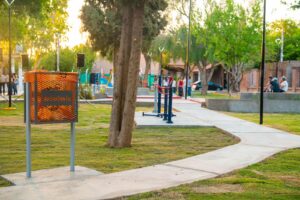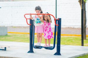 La intervención integral en la plaza del barrio Gemo II contempló la ejecución de 150 metros cuadrados de veredas con hormigón H17, junto a la construcción de 100 metros lineales de cordones perimetrales, 60 metros cuadrados de banquina y 60 metros lineales de cordones delimitadores de espacios internos, lo que permitió ordenar y jerarquizar el uso del predio. Además, se construyeron puentes rampa para mejorar la accesibilidad y se incorporaron juegos infantiles y nuevos aparatos de salud, promoviendo espacios inclusivos para el esparcimiento y la actividad física.