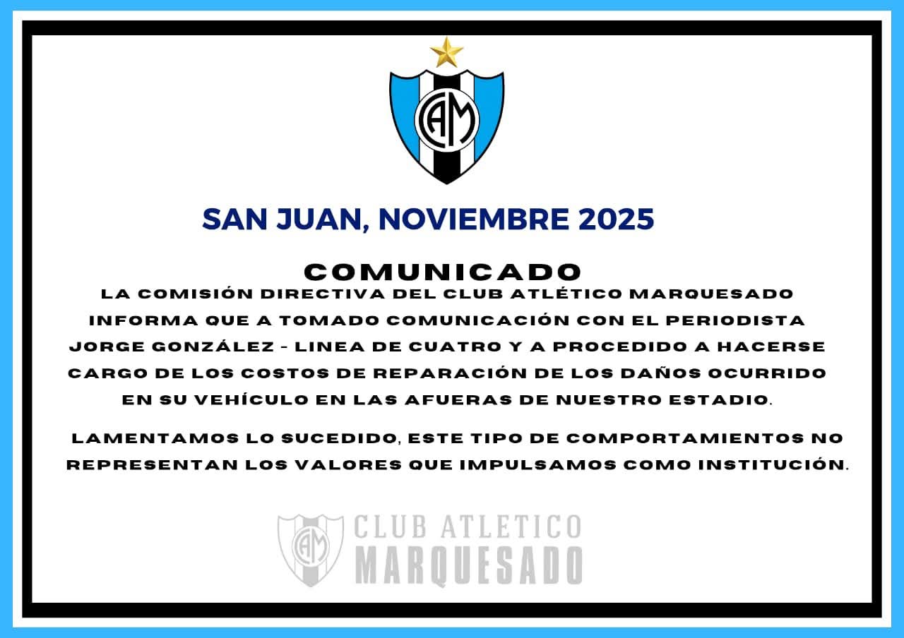 El periodista Jorge Luis González, quien trabajó en la cobertura del encuentro que disputaron el tricolor y Sp Desamparados, sufrió la rotura de la luneta de su automóvil, luego de que hinchas de Marquesado arrojar proyectiles contra el colectivo que trasladaba a los jugadores visitantes. Es por eso que ante ésta situación, el Club de Rivadavia decidió tomar el guante y hacerse cargo de los daños ocasionados por los vándalos.
