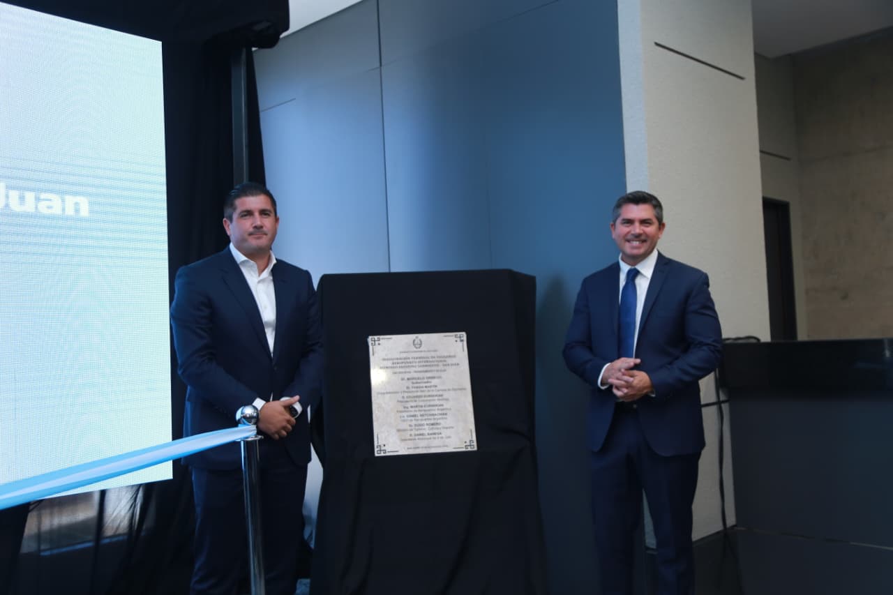 El gobernador Marcelo Orrego encabezó la inauguración de la segunda etapa de las obras de modernización del aeropuerto Domingo Faustino Sarmiento. Esto permitirá que la terminal aérea sanjuanina alcance estándares operativos y tecnológicos comparables a los principales aeropuertos del país. El acto estuvo encabezado además por Daniel Ketchibachian, CEO de Aeropuertos Argentinos. Acompañaron funcionarios provinciales.