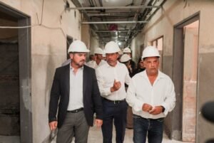 Durante el recorrido, se explicó que el Hospital Dr. Marcial Quiroga cuenta con una superficie aproximada de 18.000 metros cuadrados distribuidos en tres niveles —subsuelo, planta baja y planta alta— organizados en tres bloques principales interconectados por una circulación central, lo que exige una planificación técnica precisa para garantizar su funcionamiento continuo durante la obra.