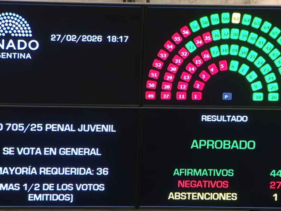 El oficialismo logró un nuevo triunfo en el Congreso con la sanción del Senado del nuevo régimen penal Juvenil, que establece la baja de la edad de imputabilidad a los 14 años. La medida fue aprobada con 44 votos positivos y 27 negativos. La sesión continuará con el debate y la posterior votación de la Reforma Laboral, que se espera también logre el apoyo de la cámara.