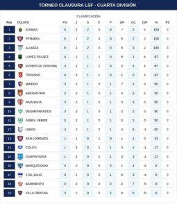 La fecha programada para éste fin de semana se jugó de forma completa, la misma arrancó el sábado con tres encuentros y se completó en la jornada de ayer con el resto de los partidos. Con Trinidad a paso firme goleando en un difícil reducto a CAIVO, otra goleada ocurrió en el 12 de Octubre, donde el Campeón del Apertura venció a Minero. En uno de los partidos más atractivos del fin de semana y que se disputó en Santa Lucía, Alianza y Sp Desamparados repartieron puntos,con la novedad que la Dirigencia lechuza aplicó el derecho de admisión, para tratar de acabar con los violentos. La acción había comenzado el sábado, con los empates de Marquesado vs Peñarol, el de Colon con López Pelaez y la contundente victoria de Atenas sobre Sarmiento.