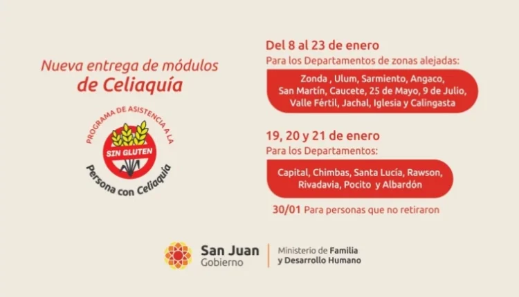 En el Gran San Juan, la distribución de los módulos alimentarios para personas con celiaquía de los departamentos Capital, Chimbas, Albardón, Santa Lucía, Rivadavia y Rawson, además de Pocito, se realizará los días 19, 20 y 21 de enero en el depósito del Ministerio de Familia y Desarrollo Humano en calle Salta 1734 N. de 8:00 a 12:30 hs.