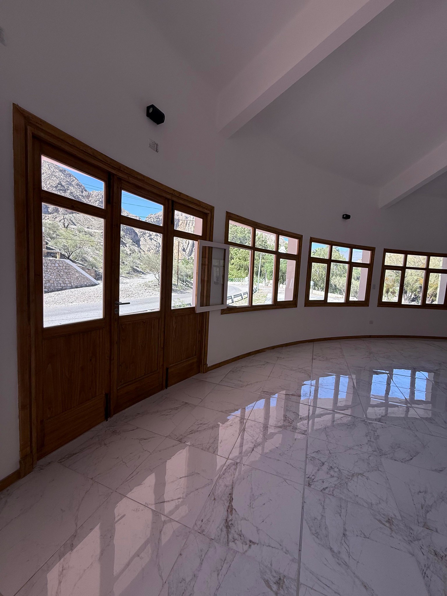 Se ejecutó un nuevo muro exterior que reemplazó estructuras deterioradas, manteniendo como eje la puesta en valor del volumen circular, principal rasgo distintivo de la hostería. El cerramiento fue revestido con piedra similar a la del cerro, integrando el edificio al paisaje y reforzando su identidad. Este criterio se replicó en sectores del interior, generando continuidad visual entre exterior e interior.