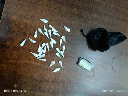 Ademas de las faltas que se le imputaron a Díaz, este guardaba entre sus prendas una bolsa de nylon color negro, la que contenía 32 envoltorios, con una sustancia de color blanca.