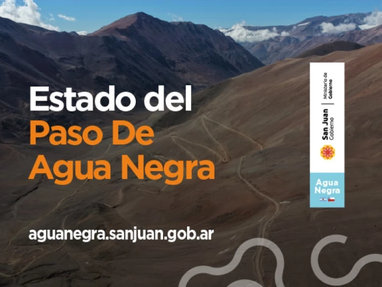 El Ministerio de Gobierno, a través de la Secretaría de Relaciones Institucionales, informa que el Paso Internacional por Agua Negra, Ruta Nacional 150, se encuentra Habilitado para circular de 07:00 a 17:00 hs.