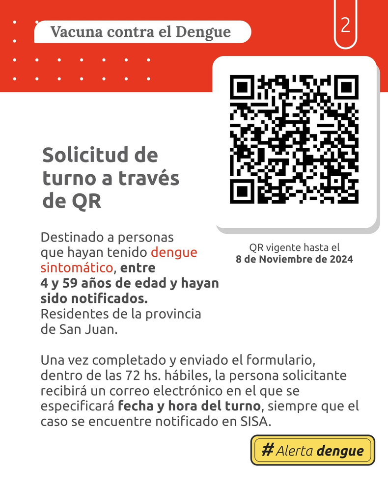 – Destinado a personas que hayan tenido dengue sintomático, entre 4 y 59 años de edad residentes de la provincia de San Juan y que se encuentren notificados en SISA.