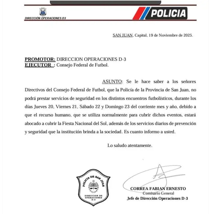 La decisión quedó asentada en un documento emitido por la Dirección de Operaciones D-3 de la Policía de San Juan, fechado el 19 de noviembre de 2025, y dirigido a los directivos del Consejo Federal de Fútbol. En la nota, el organismo policial detalla que el personal habitualmente afectado a la cobertura de eventos deportivos estará abocado casi en su totalidad a la Fiesta Nacional del Sol, uno de los operativos más grandes del calendario provincial, además de cumplir con las tareas diarias de prevención y seguridad en todo el territorio.