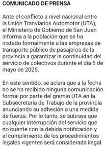 En adhesión a la medida tomada a nivel Nacional, el Secretario General local dió a conocer que en San Juan tampoco habrá colectivos éste martes.