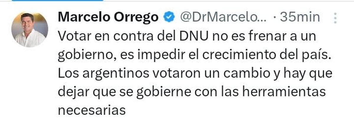 Con una fuerte crítica a quienes votaron en contra, Orrego sostuvo que: “Votar en contra del DNU no es frenar a un gobierno, es impedir el crecimiento del país”. Entre los votos en contra que recibió el proyecto estaba el de los legisladores sanjuaninos, Sergio Uñac y María Celeste Giménez.