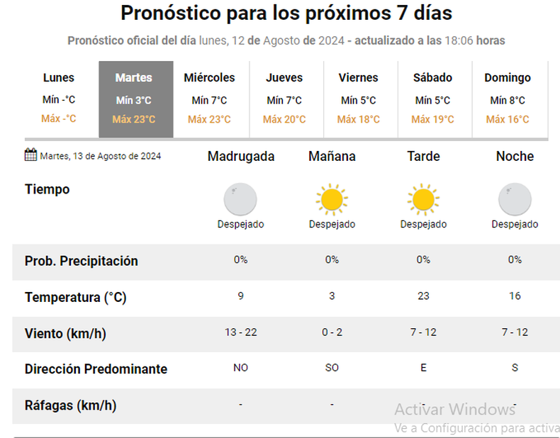 Según el Servicio Meteorológico Nacional (SMN), para este martes 13 de agosto se espera una jornada que tendrá una mínima de 3º por la mañana pero levantará la temperatura y llegará a los 23º por la tarde.
