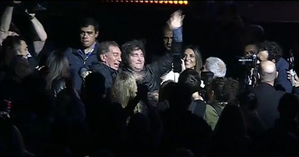 En su primera intervención política de la noche, Milei agradeció especialmente a su hermana Karina, secretaria general de la Presidencia, y al asesor Santiago Caputo, a quienes definió como parte del “triángulo de hierro”.