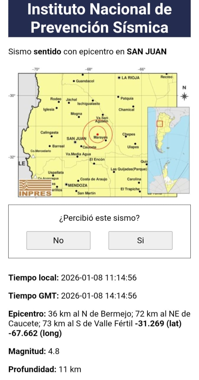 Cerca de las 11.15 hs de la mañana se percibió un importante movimiento telúrico en la Provincia. El epicentro se localizó al norte de Beemejo, al Noroeste de Caucete y al sur de Valle Fértil. En un principio se supo que la intensidad había sido de 5.1 °, pero luego el INPRES lo verificó y confirmó que se trató de un sismo de intensidad 4.8° en la escala de Richter.