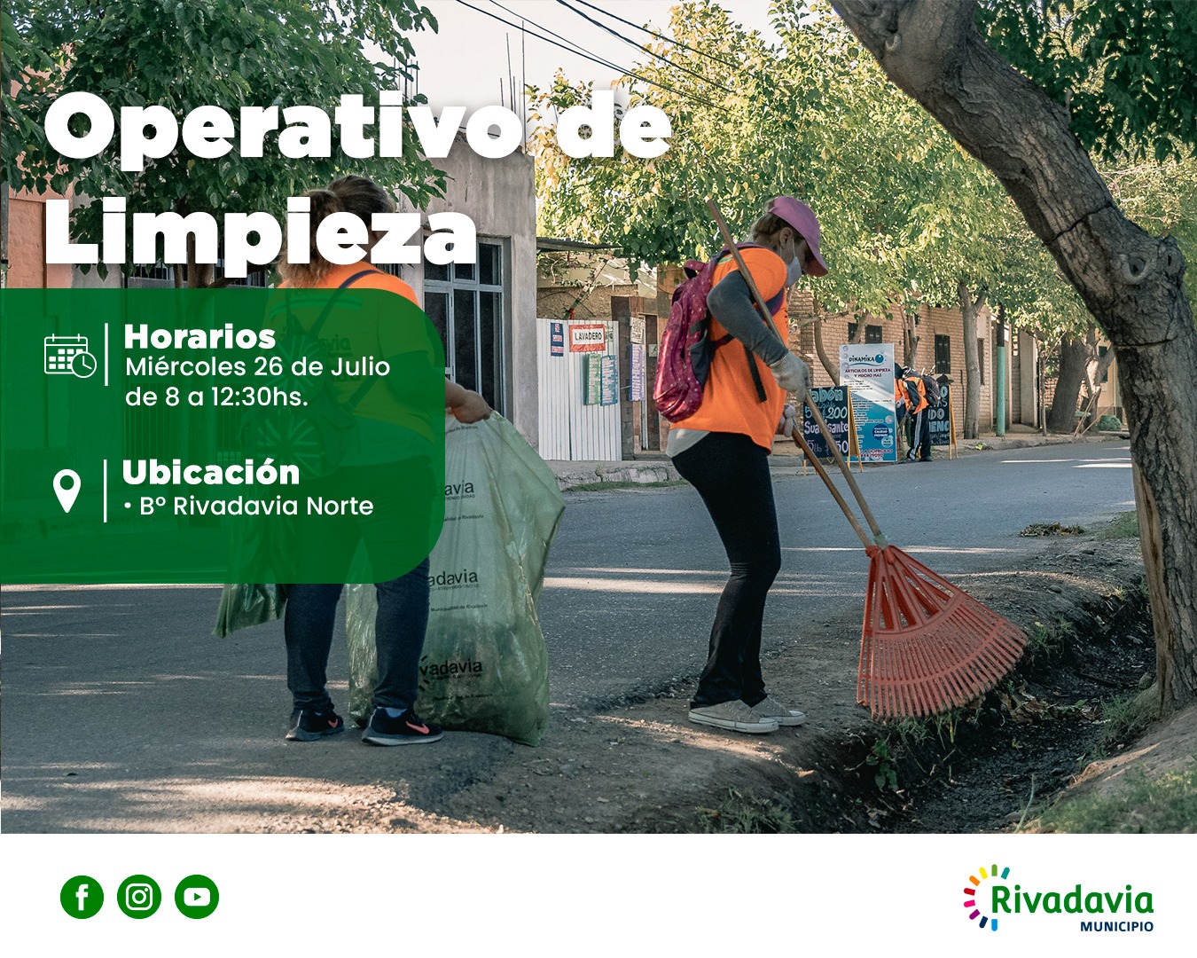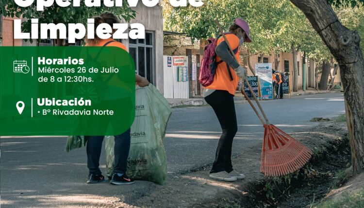 En esta oportunidad estaremos en un nuevos operativos integrales de limpieza ,esto se realizará Mañana Miercoles 26 de julio de 8 a 12,30 horas en Barrio Rivadavia Norte.