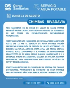 Desde Obras Sanitarias informaron que este lunes 11 de agosto, el servicio de agua potable de varios barrios de Chimbas y Rivadavia se ve afectado por maniobras en el Dique de Ullum.