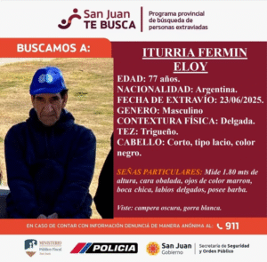 La Policía de San Juan activó este lunes un operativo de búsqueda para dar con el paradero de un adulto mayor que se encuentra desaparecido desde el lunes 23 de junio. Se trata de Fermín Eloy Iturria, de 77 años, quien fue visto por última vez en la provincia y desde entonces nada se sabe de él.