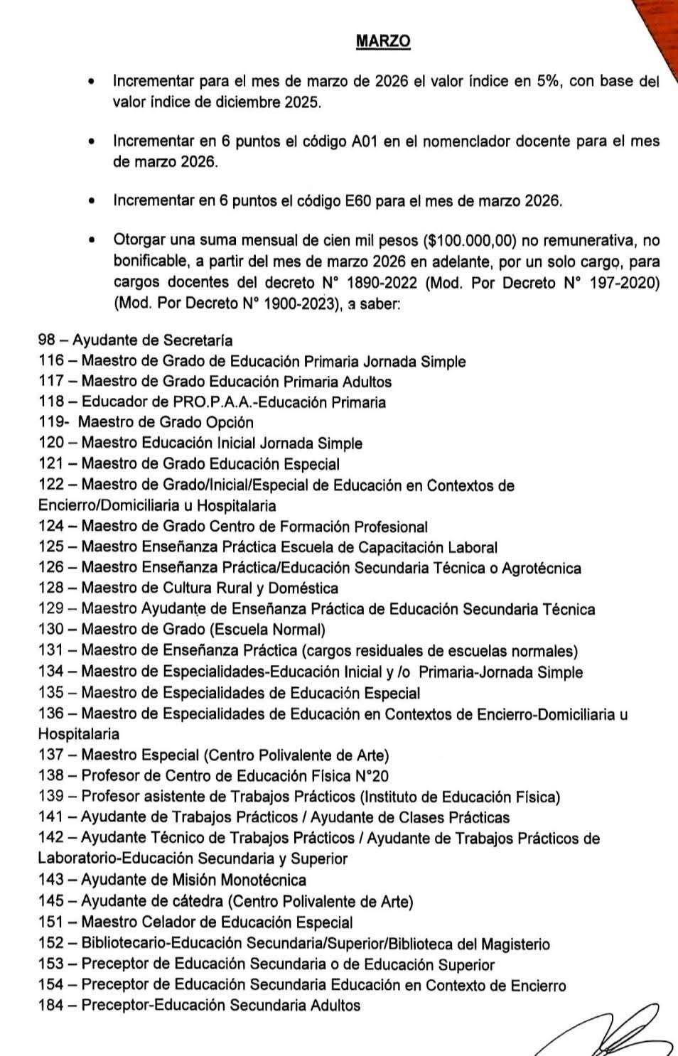 Otorgar una suma mensual de cien mil pesos ($100.000,00) no remunerativa, no bonificable, a partir del mes de marzo 2026 en adelante, por un solo cargo, para cargos docentes del decreto N° 1890-2022 (Mod. Por Decreto N° 197-2020) (Mod. Por Decreto N° 1900-2023), a saber: