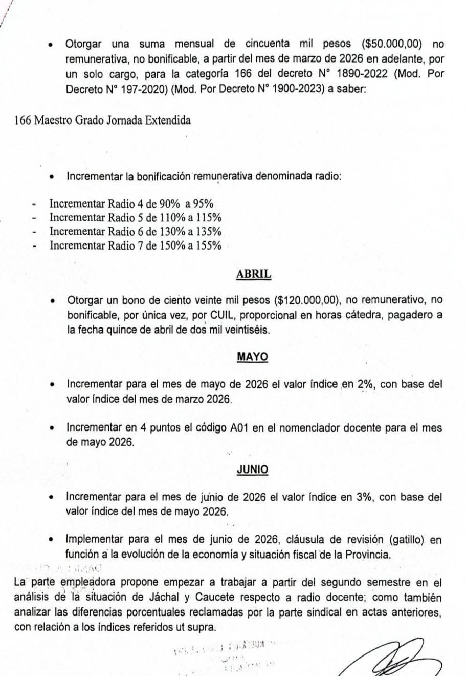 Otorgar un bono de ciento veinte mil pesos ($120.000,00), no remunerativo, no bonificable, por única vez, por CUIL, proporcional en horas cátedra, pagadero a la fecha quince de abril de dos mil veintiséis.