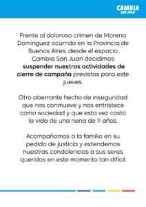 Tanto en la Provincia como en el Pais los pre candidatos se preparaban para los cierres de campaña de cara a las PASO del domingo. Sin embargo el crimen ocurrido éste miércoles en Lanús obligó a la suspensión de todos los actos previstos con ese fin. En nuestra provincia uno que hizo llegar su comunicado fue Cambia San Juan.