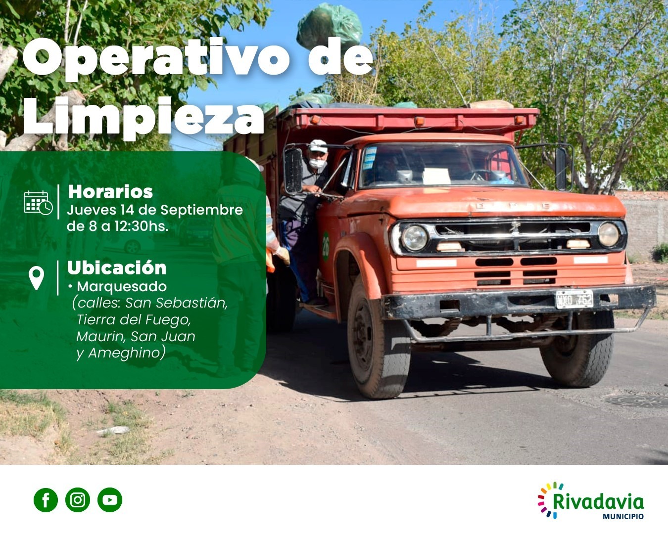 En esta oportunidad estaremos en un nuevos operativos integrales de limpieza ,esto se realizará Mañana jueves 14 de septiembre de 8 a 12,30 horas en Marquesado, Calles San Sebastian, Tierra del Fuego, Maurin, San Juan y Ameghino.