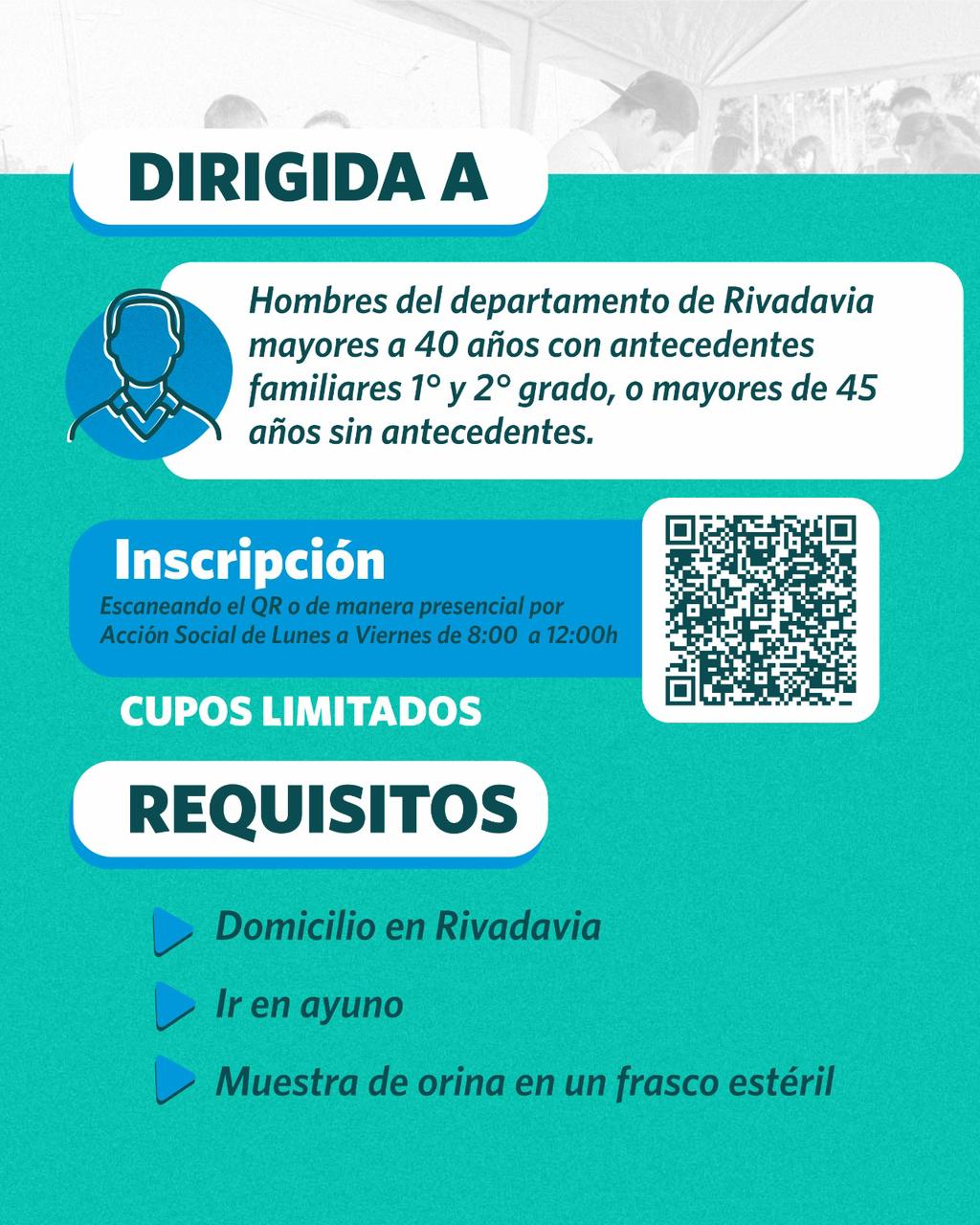 La convocatoria está dirigida a hombres del departamento de Rivadavia mayores de 40 años con antecedentes familiares de primer o segundo grado, o mayores de 45 años sin antecedentes.