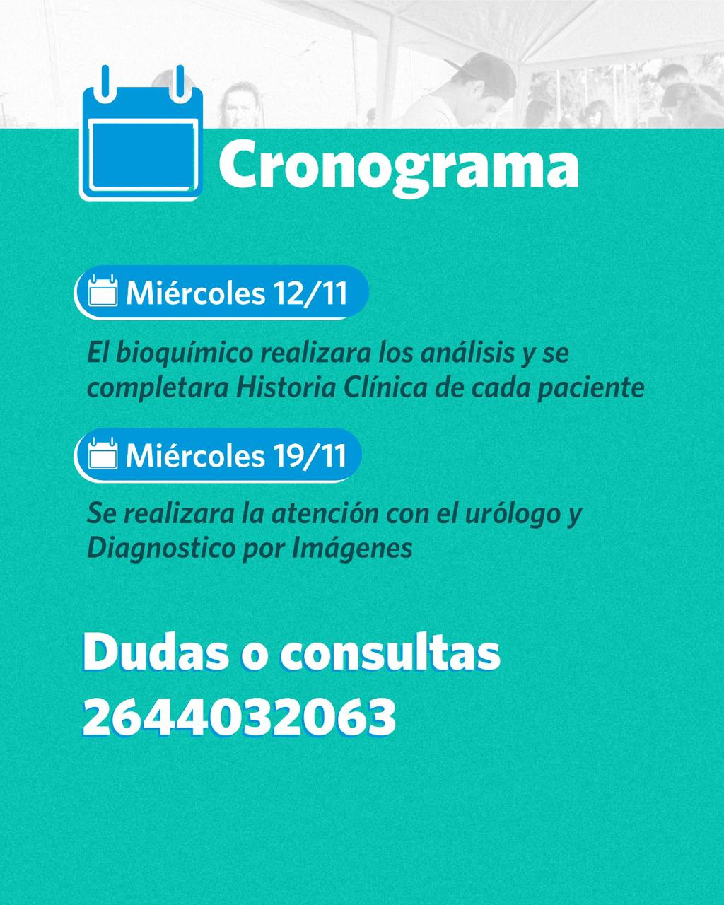 El miércoles 12 de noviembre, el bioquímico realizará los análisis y completará la historia clínica de cada paciente. En tanto, el miércoles 19, se llevará a cabo la atención con el urólogo y el diagnóstico por imágenes.