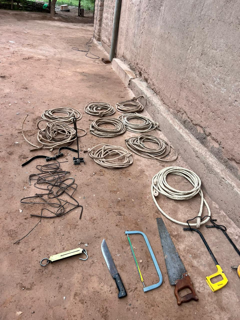 A su vez, en el domicilio de Nicolás “Chacho” Godoy los efectivos hallaron lazos de cuero, ganchos de hierro, un machete, sierras, una romana, fierros quemadores con las iniciales “JNG” y retazos de cuero vacuno, además de un celular Samsung que será analizado por los investigadores.