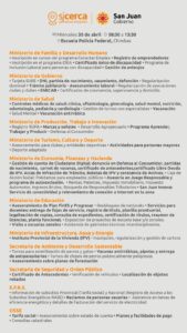 Se han dispuesto espacios para los ministerios de Familia y Desarrollo Humano; de Gobierno; de Salud; de Educación; de Economía, Finanzas y Hacienda; de la Producción, Trabajo e Innovación; de Turismo, Cultura y Deporte; también de las secretarías de Ambiente y la de Estado de Seguridad y Orden Público. Entre otras gestiones se puede realizar controles de Oftalmología (para determinar la necesidad o no del uso de anteojos para tramitarlos a través de la Dirección de Asistencia del Ministerio de Familia y Desarrollo Humano), renovar el DNI, pedir la Regularización Dominial de terrenos y escrituras de propiedades, solicitar asesoramiento sobre Derecho Laboral y previsional para jubilados y pensionados, tramitar la tarjeta SUBE y la aplicación de beneficios de Tarifa Social, acceder a controles médicos y vacunación, pedir el desbloqueo y cambio de pilas de netbook de alumnos de secundaria, pedir información sobre subsidios de energía eléctrica y agua potable, hacer reclamos, crear cuenta de Ciudadano Digital, entre otros.