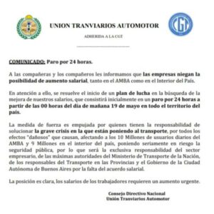 El Gremio que nuclea a los trabajadores del transporte público de pasajeros lanzó inesperadamente un paro nacional de colectivos a partir de las 00.00 hs del viernes. Las autoridades manifestaron que fracasaron las negociaciones y hay incumplimiento con los chóferes y es por eso que llevarán adelante la medida de fuerza.