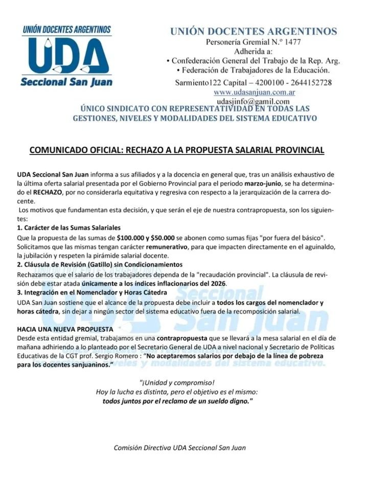 La Unión Docentes Agremiados lanzó un comunicado mediante el cual refleja el descontento ante la propuesta del Gobierno, más allá que desde el Ejecutivo sostienen que la misma fue superadora.