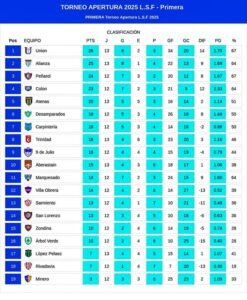 Unión de Villa Krawse lidera la tabla del Apertura local luego de la fecha 13. Es que el azul abrió la jornada el viernes con una importante victoria ante Atlético Marquesado. De esta manera y aprovechando que Peñarol cumplía con fecha libre y que Colón cayó sobre la hora en La Rinconada, los dirigidos por Eduardo Magallanes se posicionaron punteros. Por otra parte en un aprtidazo en Puyuta, el local perdía y logró empatarlo ante Trinidad y Alianza en su casa venció a Árbol Verde en el debut de Escudero como DT Arbolino.