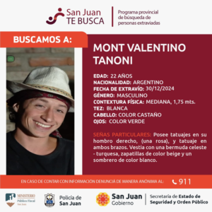 Durante las últimas horas de este 31 de diciembre, la Policía de San Juan activó el protocolo de búsqueda por un joven de 22 años que se encuentra desaparecido desde hace 48 horas, el pasado 30 de diciembre del 2024.