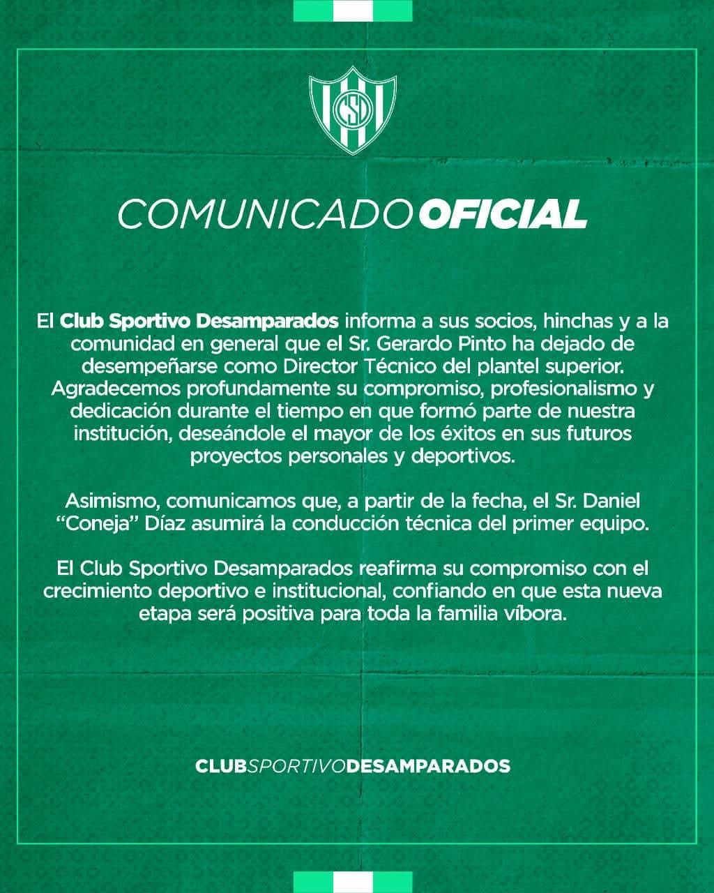 La institución del Barrio Patricias Sanjuaninas puso fin al ciclo de Gerardo Pinto al frente del plantel puyutano, luego de la derrota ante Peñaflor en San Martín, por el Torneo Regional, en el que el víbora aún no a ganado y que al término de la primera etapa se encuentra último en la tabla de la zona. Recordemos que comenzó su participación igualando con Colon, luego también sumó 1 ponen Santa Lucía ante Alianza y éste último domingo recibió un cachetazo ante el Canario en el Augusto Pulenta. Más allá de que en el torneo doméstico Desamparados jugará los play off, está claro que la prioridad es el campeonato Nacional y allí el Cuerpo Técnico no encontró el rumbo.