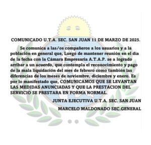 Tras la reunión mantenida con A.T.A.P la UTA levantó el paro previsto para miercoles y jueves.