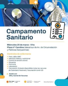 El miércoles 20 de marzo a las 9:00, la Plaza de Villa Carolina será el punto de atención de un nuevo Campamento Sanitario en la Ciudad, ubicado en el Lateral de Av. de Circunvalación y Patricias Sanjuaninas. Con el firme propósito de brindar atención médica primaria y gratuita, este evento ofrecerá a los vecinos diversos servicios de salud.