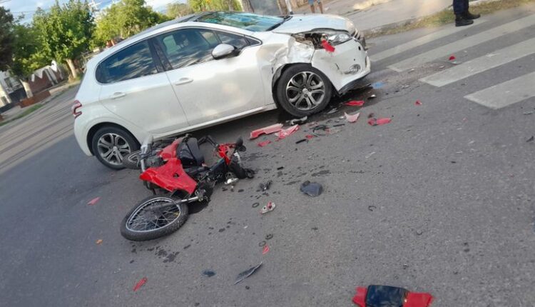 A primera hora de este lunes hubo un fuerte choque en la esquina de Rodríguez y Sarmiento en Chimbas. Una moto impactó con mucha violencia con un auto. A ambos conductores se les hizo el test de alcoholemia y dio negativo.
