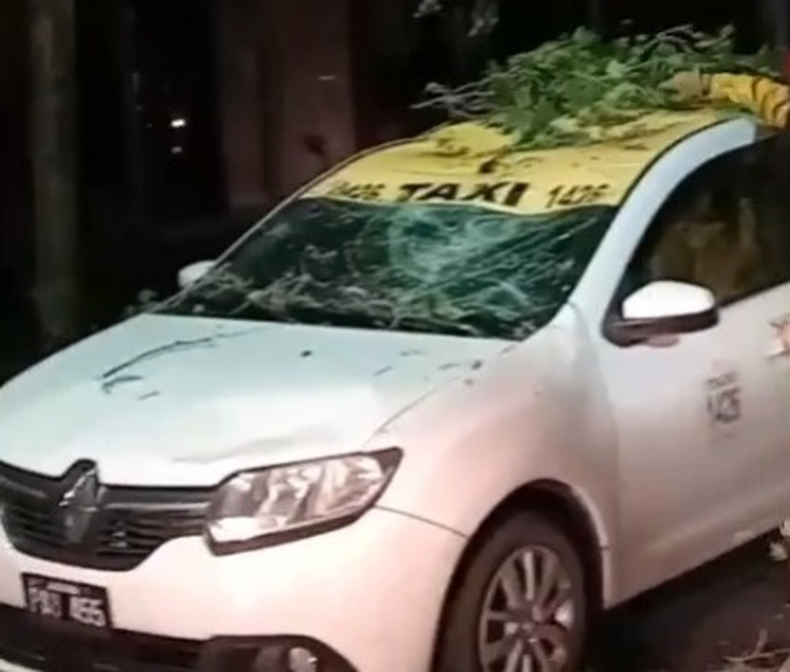 Un grave incidente ocurrió la noche del jueves, en medio de la tormenta, en Capital. Mientras un taxi aguardaba el cambio del semáforo para cruzar una esquina del microcentro, una enorme rama cayó repentinamente sobre el vehículo.